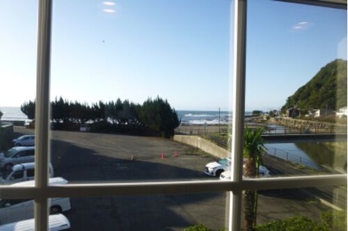 旅行の3日目に台風一過でようやく好天になった。宿の客室の窓からも青い海と青い空が見えた。 客室は建物の外廊下から入る作りになっている。昨日、着いたときは吹き降りで、とにかく早く入りたいから建物のようすを見る余裕もなかった。 外廊下から見たひ…