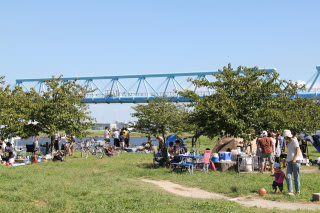 暑い日だが、天気もよく、三連休の真ん中だからか、放水路脇は妙典公園も、線路の向こうの妙典小学校前も屋外バーベキューで賑わっていた。
