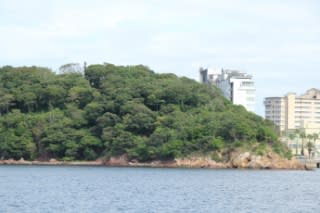 さっき歩いた舘山寺の岬を今度は海から眺める。