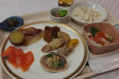 まず、温泉につかり、晩飯はバイキング。一つ一つの料理は少な目に取る。