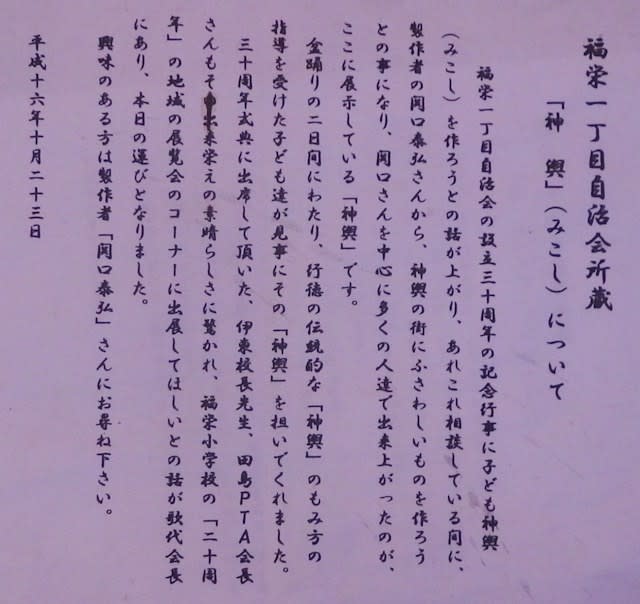 これによると、この神輿が作られたのは平成16年(2004年)。また、行徳の神輿製作会社によるものではなく、個人作のものというのも分かる。また、この説明書きは同年に福栄小学校の地域の展覧会コーナーに出展されたときのものということだ。