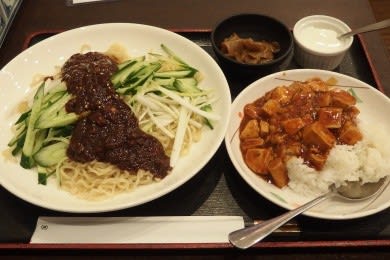 Bセットにした。ジャージャン麺+陳麻婆丼+ザーサイ+杏仁豆腐。