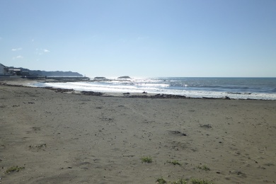 せっかく海のそばだし晴天になったし、チェックアウトまでの間に海の近くへ行ってみる。砂浜は歩きにくいし靴の中に砂が入るから、堤防のところから眺めただけだが。