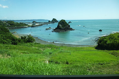 バスが通る道が海のそばを通っても樹木や背の高い草が視界を遮る。鴨川松島バス停の前後はやはり景勝地のためか、視界を遮るものが取り去られている。だけど、バスの車窓からこういう写真が撮れるのはごく短い時間だけ。