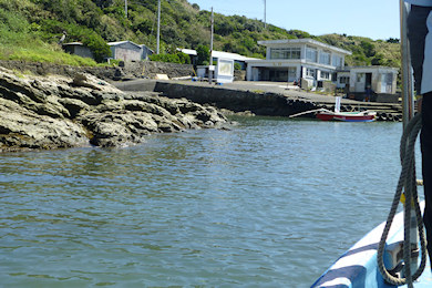 旗を振ると島の側の船着き場にいる人が手を振り、「了解」の合図を返してきた。