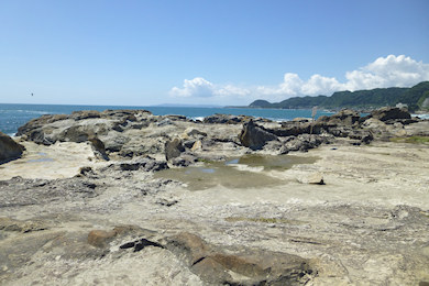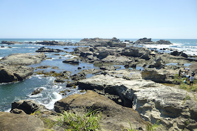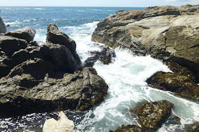 海のそばの行けるところまで行ってみる。砂浜と違い足を滑らせでもしたら岩がちで高低差があるところの海へ落ちるから、海に近づくほど慎重に足を運ぶ。晴れて海が穏やかでも、岩の間には波しぶきが上がり、けっこう迫力がある。