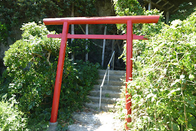 向かって左を見ると階段の上に祠があった。蓬島弁天堂祠とのこと。お詣りしてくる。