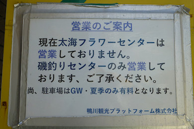 磯釣りセンターとしては営業しているようで、また、フラワーセンターの看板も撤去されずに残っている。