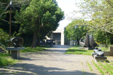 次は丘の下にある館山市博物館本館へ行く。丘の下といっても、少し上がったところにある。八犬伝博物館から坂を下るが、下りきる手前で彫刻を並べた遊歩道に入り、そこを通っていく。